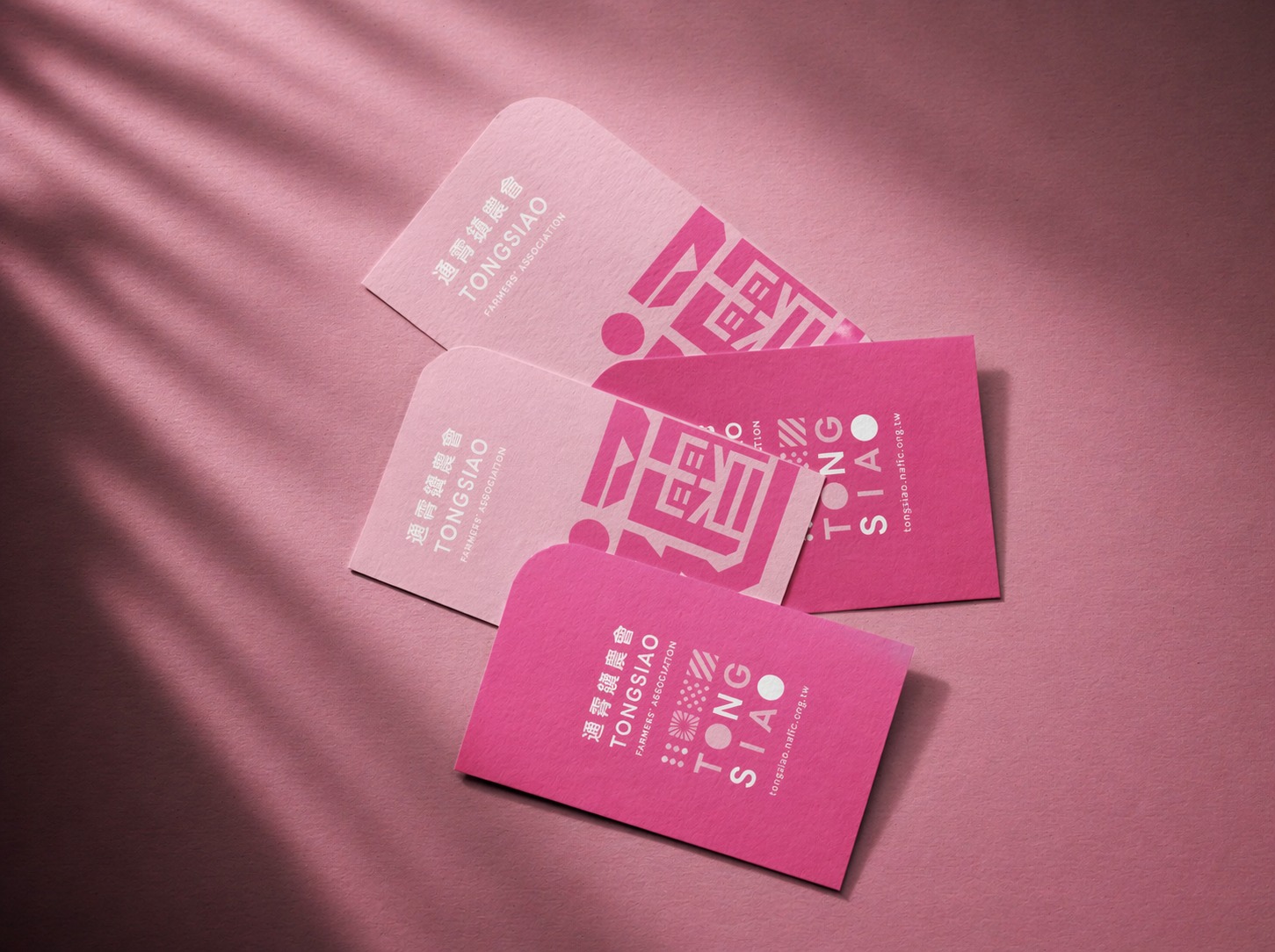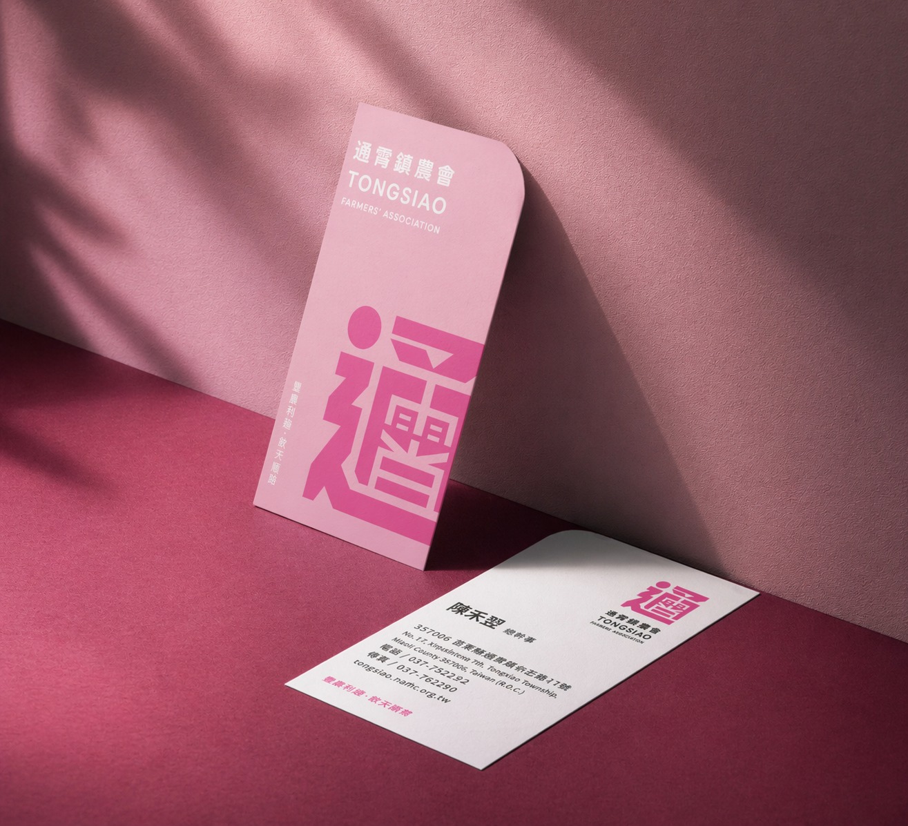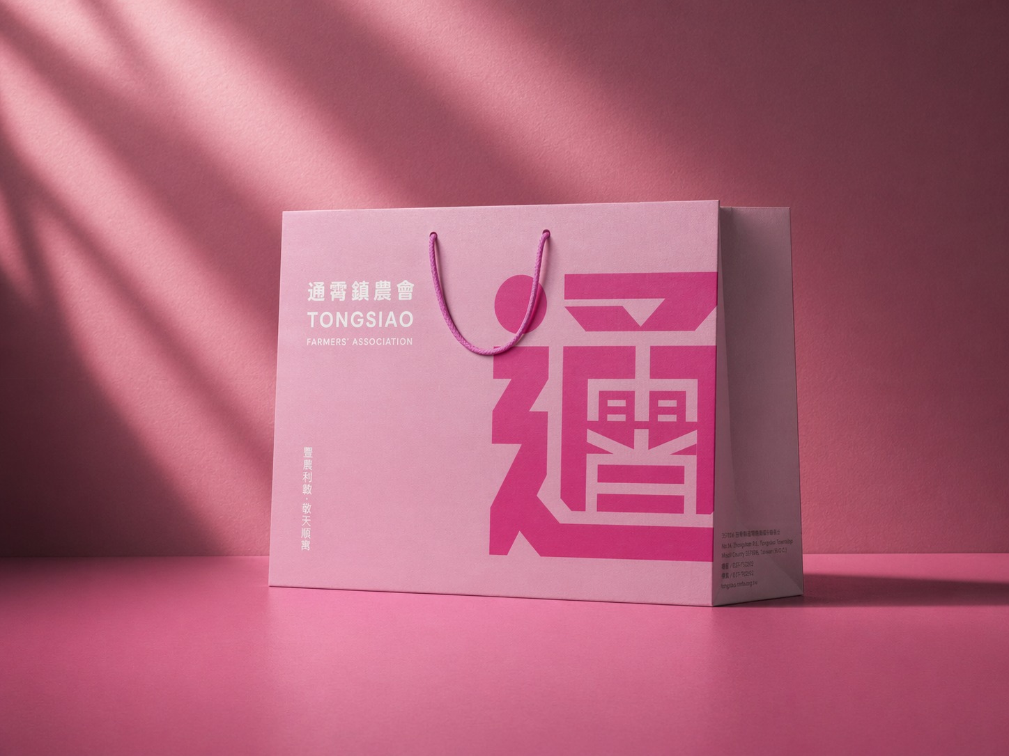 色彩策略以高辨識度的鮮明粉紅為主軸,大膽翻轉傳統農會形象,注入年輕、開放與親和的品牌氣質。透過高彩度色彩與留白的對比配置,建立強烈視覺記憶點,同時結合輔助幾何圖形延伸應用,使整體視覺在活潑中維持秩序與現代感,展現通霄鎮農會從在地基礎出發,邁向品牌化與生活化的嶄新樣貌。